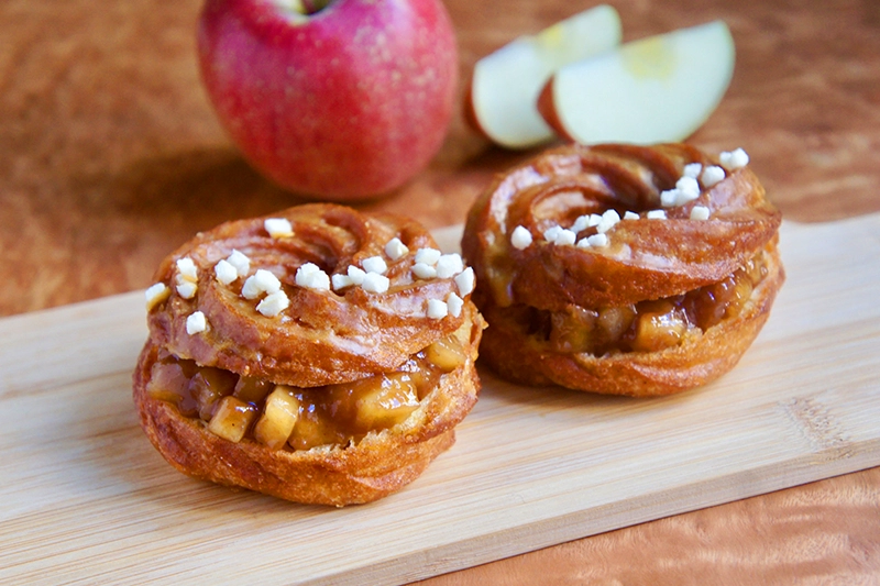 スパイスと一緒に煮たりんごをサンドして、キャラメルグレーズに、フリーズドライのりんごをトッピング!